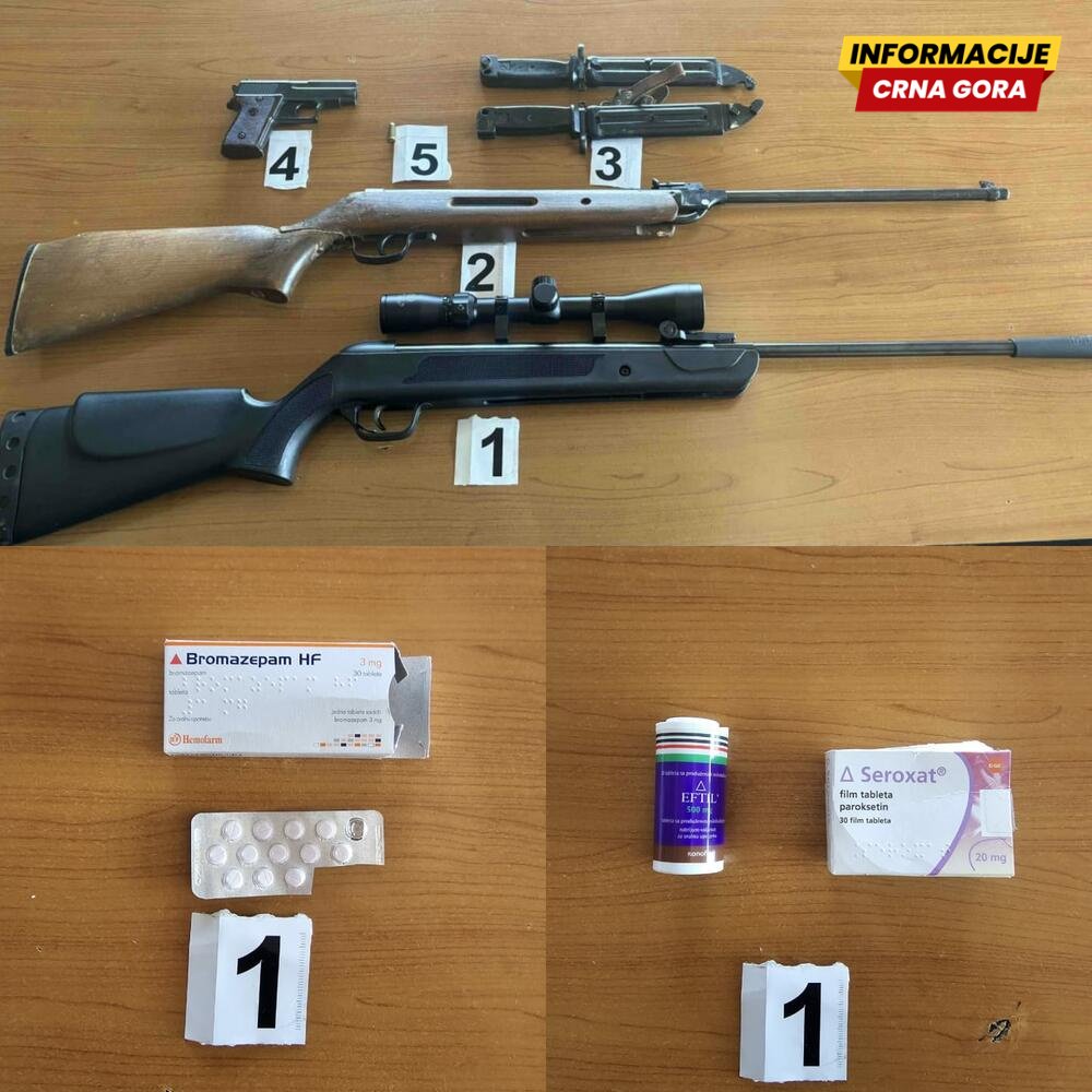 "Pretresom kod operativno interesantnog lica M.R. iz Berana pronađene su i oduzete dvije puške, pištolj, komad municije i 12 komada tableta sa liste opijata. Nadalje, prilikom pretresa kod operativno intreresantnog lica V.T. takođe iz Berana pronađena su i oduzeta 43 komada tableta sa liste opijata, a kod operativno interesantnog lica D.Ć. 29 komada", saopšteno je iz Uprave policije.