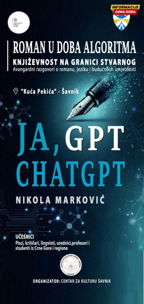 Promocija romana “Ja, ChatGPT” autora Nikole Markovića, novinara i generalnog direktora RTV Nikšić biće održana u ponedjeljak, 20. aprila, u Kući Pekića u Šavniku, u okviru događaja koji će okupiti književnike, teoretičare i ljubitelje pisane riječi.