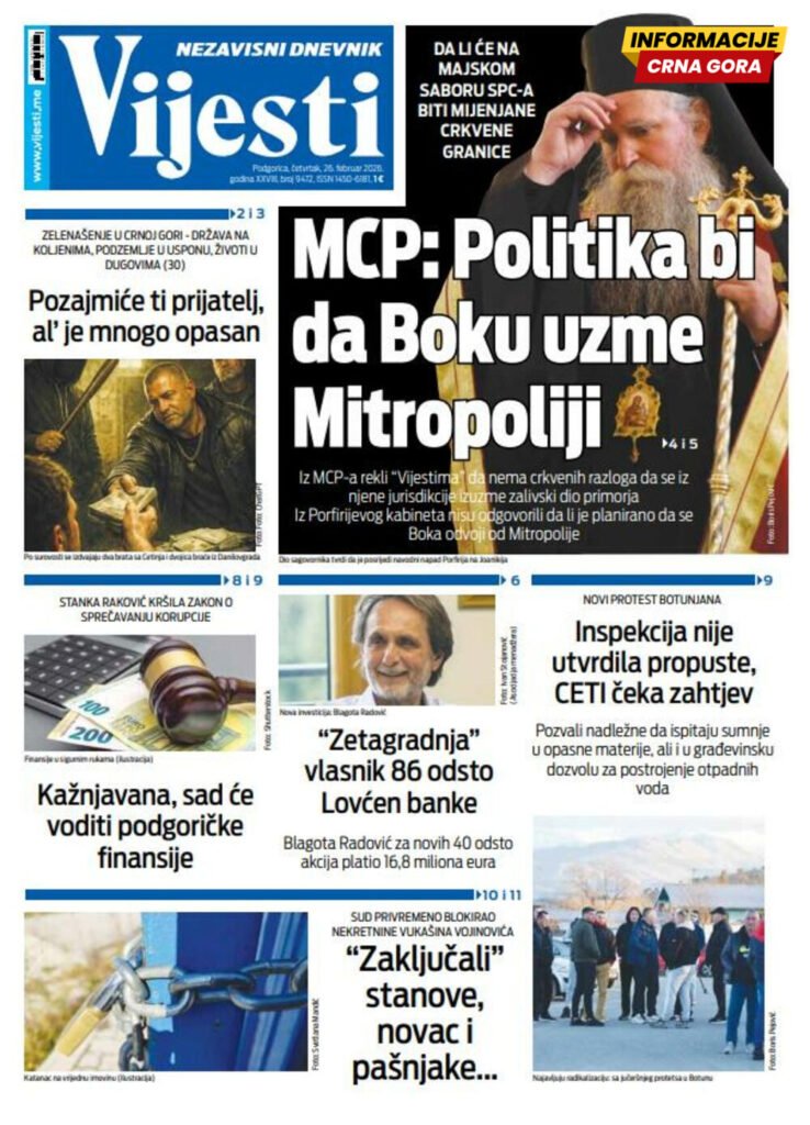 Naslovna strana “Vijesti” za 26. februar 2026.
