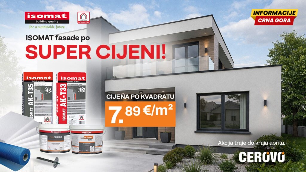 Kompanija Cerovo i ovog proljeća donosi odličnu priliku za sve koji planiraju renoviranje ili gradnju kompletan Isomat demit fasadni sistem sada je dostupan po još nižoj promotivnoj cijeni od samo 7,89 eura/m², za prosječnu potrošnju materijala u bijeloj boji!