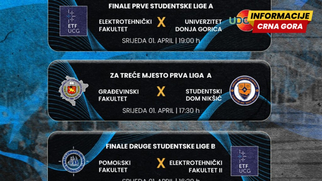 Kruna večeri biće veliko finale Prve Monteput studentske lige u 19 časova, u kojem će se sastati Elektro-tehnički fakultet i Univerzitet Donja Gorica, u duelu koji obećava vrhunski futsal i dostojan završetak sezone. Branilac titule je do finala stigao dominantnom partijom u polufinalu, u kojem je savladao Građevinski fakultet sa čak 5:1, potvrdivši ulogu glavnog favorita za odbranu trona.
